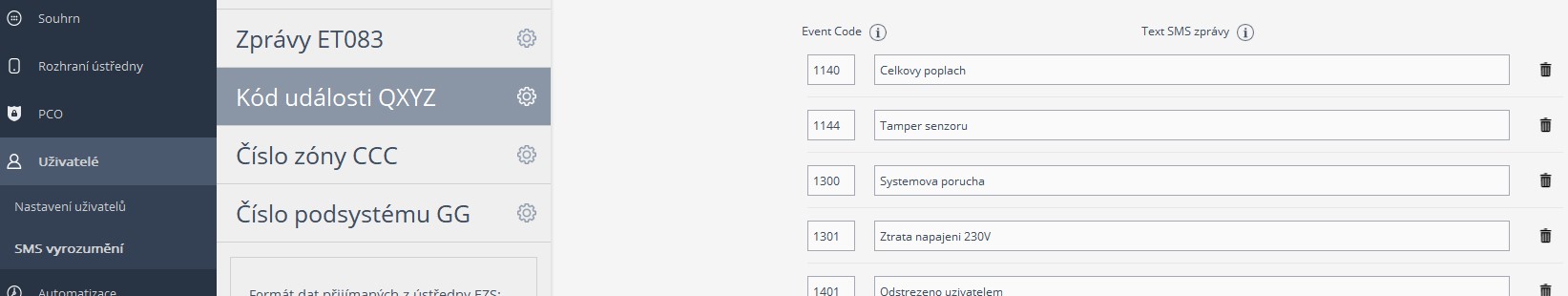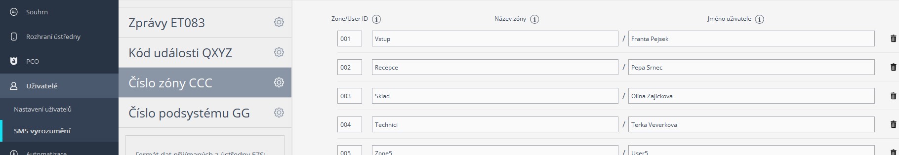 Rovněž tak lze editovat názvy zón, uživatelů a podsystémů tak, aby uživatel obdržel v SMS zprávě vždy přesný a srozumitelný popis události, která v jeho alarmu nastala: