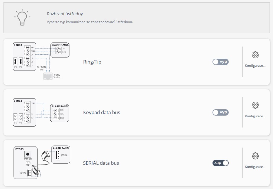 V konfiguraci GSM/GPRS komunikátoru ET083 zvolte komunikaci přes rozhraní SERIAL: