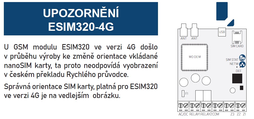- Verze ESIM320-4G podporuje datovou komunikaci po mobilních sítích 4G (LTE) i 2G (GPRS)