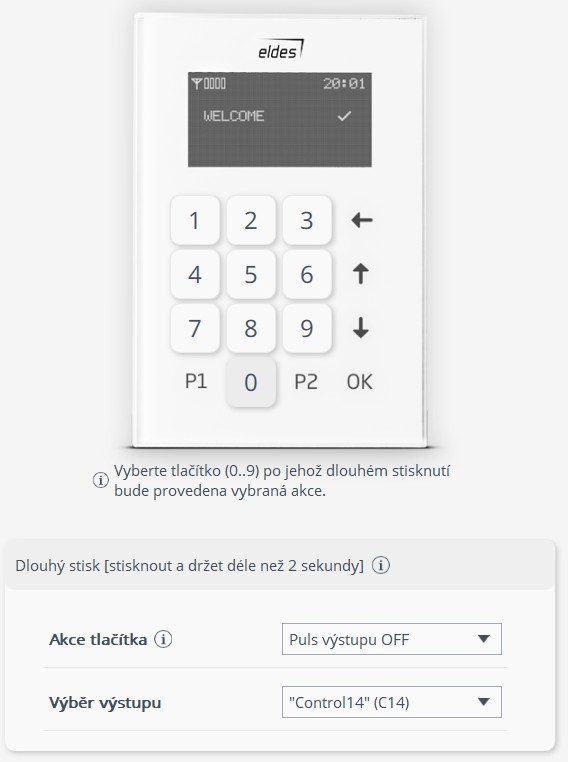 Detektor není (v souladu s požadavky normy) vybaven funkcí "autoreset", což znamená, že zůstane v poplachovém stavu i po odeznění příčiny poplachu a pro návrat do klidového stavu je třeba odpojit jej na okamžik od napájecího napětí. Ve spojení s našimi zabezpečovacími systémy Eldes lze tento požadavek velmi komfortně vyřešit podržením vybrané klávesy na dotykové klávesnici EKB2. Naprogramování této funkce (kterou lze mimochodem využít i ke spoustě jiných funkcionalit - jako je např. jednotlačítkové ovládání systému) je pomocí konfiguračního programu Eldes Utility velmi jednoduché. Stačí si v menu "Periferní zařízení - Další - EKB2 Rychlá volba" vybrat příslušnou klávesu a přiřadit jí příslušnou funkci. V našem případě (na vedlejším obrázku) nastavujeme tuto funkci na klávesu "0". Napájení požárních detektorů pak zapojíme na svorky ústředny AUX+ a vybraný PGM výstup, kterému nastavíme funkci Puls OFF. Na takto nastaveném výstupu bude stále k dispozici mínus napájení, pouze v případě jeho aktivace (např. přes klávesu "0") dojde na nastavenou dobu (v našem případě 3 sekundy) k odpojení napájení, následně se napájení zase automaticky obnoví. Při zapojování většího počtu hlásičů na tento způsob napájení je třeba mít pouze na paměti, že povolený proud PGM výstupu je u ústředen Eldes max. 500mA. Pokud bychom se této hodnotě blížili, je potřeba napájení rozložit na více PGM výstupů.